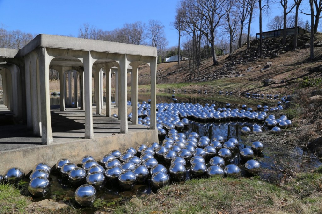 “Narcissus Gardens” provides a similar experience, while amplifying the scenes of the surrounding natural environment. The multiple mirrored surfaces, comprised of 1,300 floating steel spheres each approximately 12 inches in diameter, reflects the wooded landscape. Floating next to the Johnson-designed “Pavilion in the Pond” (a concrete structure consisting of pre-fabricated concrete arches, roof segments, and base built in 1962), the installation will still maintain its own aspect of movement by flowing with the wind and water’s natural currents.