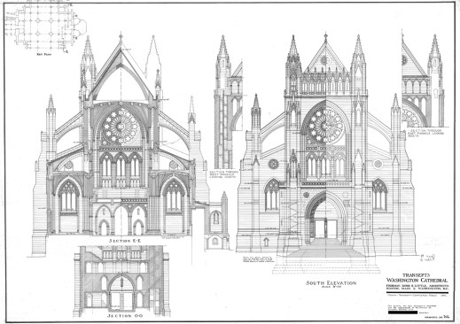 The second-largest cathedral in the United States is passing off its design and construction archives to the National Building Museum (NBM), in Washington, D.C., where its contents will be digitized, organized, and conserved, and likely used in future exhibitions. The collection comprises more than 32,000 architectural drawings, photographs, and microfiche detailing the evolution of the Neo-Gothic Cathedral of Saint Peter and Paul (commonly known as the Washington National Cathedral), as well as other historical buildings on the 57-acre campus in Washington, D.C.’s northwest quadrant, from the site’s selection in 1896 through 2007.