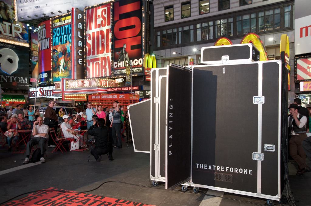 A cast of one performs for an audience of one in A Theatre for One, a five-day show in Duffy Square, New York, conceived by Christine Jones, a freelance set designer. Local architecture firm Lot-Ek designed the compressed stage-and-house after a confessional and peep-show booth. The black theater is made out of what looks like rock-and-roll road boxes, with one-half box each for the actor and audience, and separate entrances for each. The audience box is lined in red velvet. Check out a show on a first-come, first-serve basis through June 12. • theatreforone.com