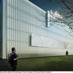 His design for the galleries consists of a series of softly rendered sculptural divisions enclosed in a crisp glass-and-steel shell. The interior walls are hollow cast-in-place concrete slabs, which contain and conceal the mechanical equipment. A white aluminum shell is articulated with ultra-thin, vertical glass blades, occasionally interrupted by expanses of flat vision glass. In particular, a 150-foot-long window wall will provide views from the interior to the campus green and from the green into the galleries, unifying the indoor and outdoor experience.