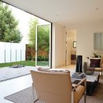 To buffer living spaces from the public, the garage and entry stair occupy the front half of the floor plan at street level. A family room stretches the width of the house at the rear, opening onto a compact, private garden with a fence of obscure-glass panels that, Maniscalco says, “kind of reverses the sense of enclosure.” Kitchen, dining, and living spaces fill the second floor, with a great room at the rear and formal dining and living areas at the front. The master bedroom and two children’s rooms are on the third floor, while the fourth floor holds an office and a media room, each with its own terrace, and access to the roof deck.