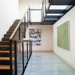 Exposed steel framing and glass railings give the central hall a bold visual character that contrasts with the house’s otherwise muted palette, and its welded plate-steel stair represents something of a technological tour de force. While each flight’s folded plane appears to float clear of its adjacent wall, every fourth riser extends into the wall, acting as a cantilevered beam. Walnut treads and railing caps weave the assembly into the material scheme of the surrounding space, while its low profile maximizes the transmission of light from above.