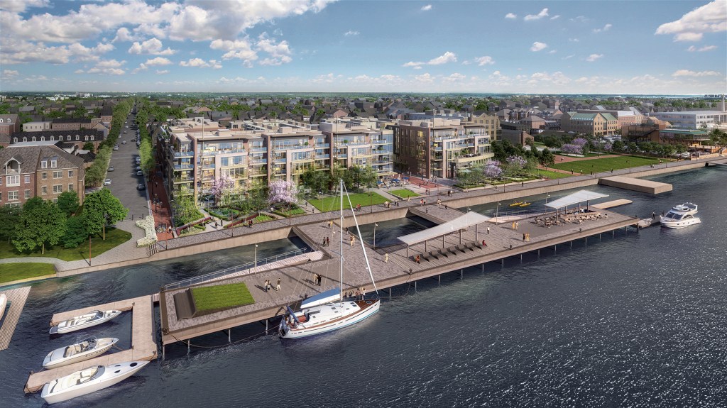 The site plan includes the re-creation of The Strand, a historic street that had been diverted during one of the site’s previous uses, and of east-west alleys that provide views of the water from the street. “When we were doing our archaeology about 15 to 20 feet down from where the current street level is right now, we were able to find the remains of the original Strand, which was stone with brick gutters,” Griffin says. “Our new internal street and sidewalks are going to follow that old historic map.”