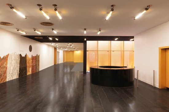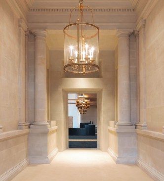 After visitors proceed through checkpoints and ticketing, they enter the chĂąteau through two meticulously restored, classically detailed vestibules built of limestone. They are very much a distillation of the exterior by the 18th-century Neoclassical architect Ange-Jacques Gabriel: Perrault is conditioning visitors ceremonially to the spirit of the palace, as though they were guests. Visitors then step into a long reception hall that the architect carved from the original structure, where he removed the transverse bearing walls. Wide brass lines inlaid in a bronze floor outline the footprint of the former walls; the bronze floor itself reiterates the famous Versailles parquet pattern, a basketweave of wood inset within a diagonal grid.