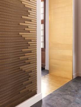 Perhaps recalling the palaceâs ceiling frescoes while also alluding to the parabolic reflector, Lauriot-PrĂ©vost draped gold-anodized aluminum wire mesh down the length of the ceiling, which swoops in parabolic contours of varying depth. Their shapely movement abstracts the Baroque gestures of the palace, and the gold tints the light, sustaining Louisâ Sun King metaphor in todayâs materials. âWe calibrated the tonality by introducing warm metals: bronze, copper, and the gold anodized aluminum,â says Perrault. âI wanted to introduce industrial materials and bring a modern sensibility to this historical context. They act as hyphens across time, from the contemporary to the historic, establishing a dialogue between the new and the old.â