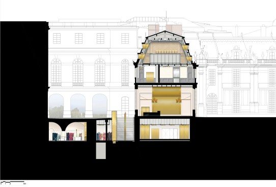 With his big move tucked away in the basement, Perrault concentrated his modernist invention in the interior of the Pavillon and the Old Wing. The fabric of the original had already been compromised by a 1920s reconstruction of the failing building, done in reinforced concrete. On the second and third floors, where some of the original paneling survived, he pursued a period restoration, outfitting the spaces for a restaurant complex to be run by Alain Ducasse. On the back part of the third floor, he fashioned a 150-seat theater within a wood-slatted shell shaped like an inverted hull.