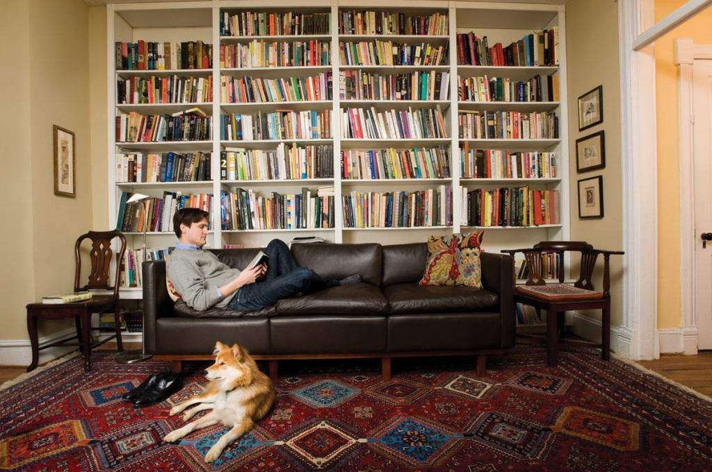 I assume everyone probably could use a break from my usual finger wagging, so this month I’m taking a cue from Unpacking and sharing my own favorite books, along with a self-indulgent picture of me and my best friend Mortimer in my home library. (Yes, that’s a Kindle I’m holding. Don’t tell Walter Benjamin.)