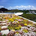 Flowering sedum blankets about 35% of the roof, a popular spot for local high school educational tours.