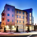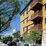 Curtain walls on the stair towers offer residents views of the Mystic River and Boston skyline. The building also has a slow-rise elevator that uses no oil, and 95% of its components are recyclable.