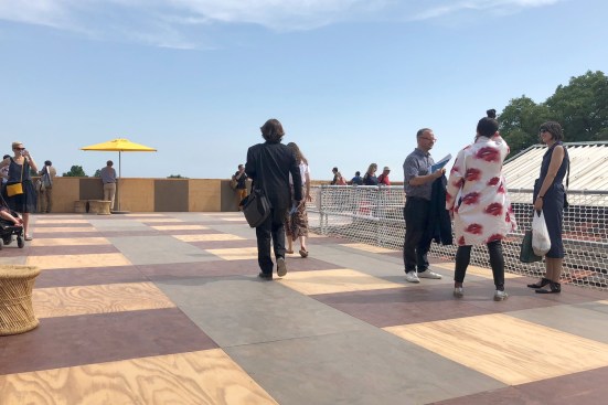 This is not the only space the British offer this year. Instead of going inside the pavilion, you can climb up to the buildingâs roof along a staircase built into scaffolding that completely covers the exterior. That temporary covering not only removes the pavilionâs status as a monument in a way grander than the Estonians were able to achieve with their little insertion, but it also supports a terrace that covers the whole roof, giving you a view from the Lagoon all the way to the Grand Canal. Only the peak of the roof sticks out above the plywood terrace, reminding you of the pastâand of gravity. Here you are at one with, but at a distance from, a particularly beautiful slice of Europe, which is exactly the curatorsâ point.