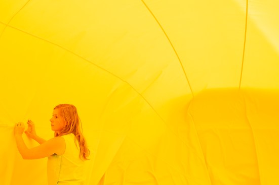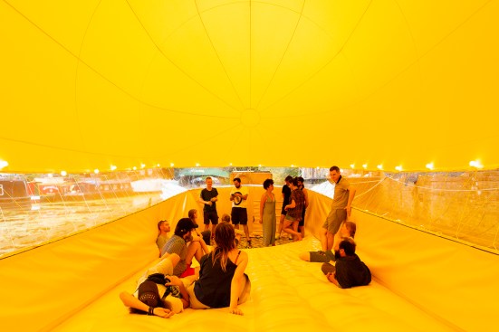 A tribute to Australian artist Jeffrey Shaw and the work of Ant Farm—a former San Francisco–based avant-garde architecture and design collective—the barge was brought back to life as a traveling cultural venue, “a space for relaxation and performance,” the designers called it in a press release. The team worked with Cameron Balloons and London-based structural engineer AKT II to build a two-level, inflatable structure that could travel under the canal’s lowest bridges. As a result, AirDraft can deflate quickly to provide enough clearance when floating under the bridges on the canal. “This provides the potential for Ouse and her new cargo to relocate and tour if desired,” Randall-Page says on his website. When inflated, AriDraft can accommodate up to 30 people.