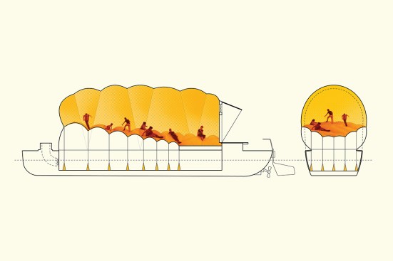 Now in its second year, the program challenged participants to repurpose a 62-foot-long 1934 motor barge—called Ouse, it is normally anchored alongside the Hoxton Docks—as the base for a floating structure. “As with its predecessor, the concept of the floating Antepavilion is not prescribed,” noted the competition brief. “Entries may be purely sculptural, structural, or political, or have a real or notional function such as social, habitable, or performance space.” The participating teams were also encouraged to use recycled and renewable materials, and to take into consideration the context and history of the canal.