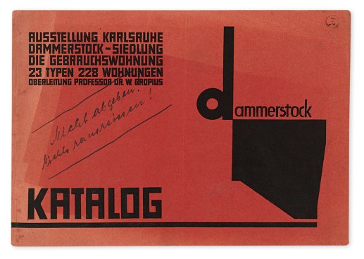 A catalog published in 1929 to mark the opening of a modern workers housing estate in Karlsruhe, Germany, planned by Walter Gropius: Dammerstock Katalog: Austellung Karlsruhe Dammerstock-Siedlung die Gebrauchswohnung. 23 Typen. 228 Wohnungen. Gropius edited the catalog himself, and Kurt Schwitters did the graphic design. Estimate: $600 – 900