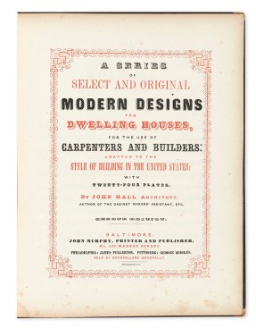 An 1848 pattern book by Baltimore architect John Hall, with a knockout title page and insanely descriptive title: A Series of Select and Original Modern Designs for Dwelling Houses, for the Use of Carpenters and Builders Adapted to the Style of Building in the United States. Estimate: $800 – 1,200