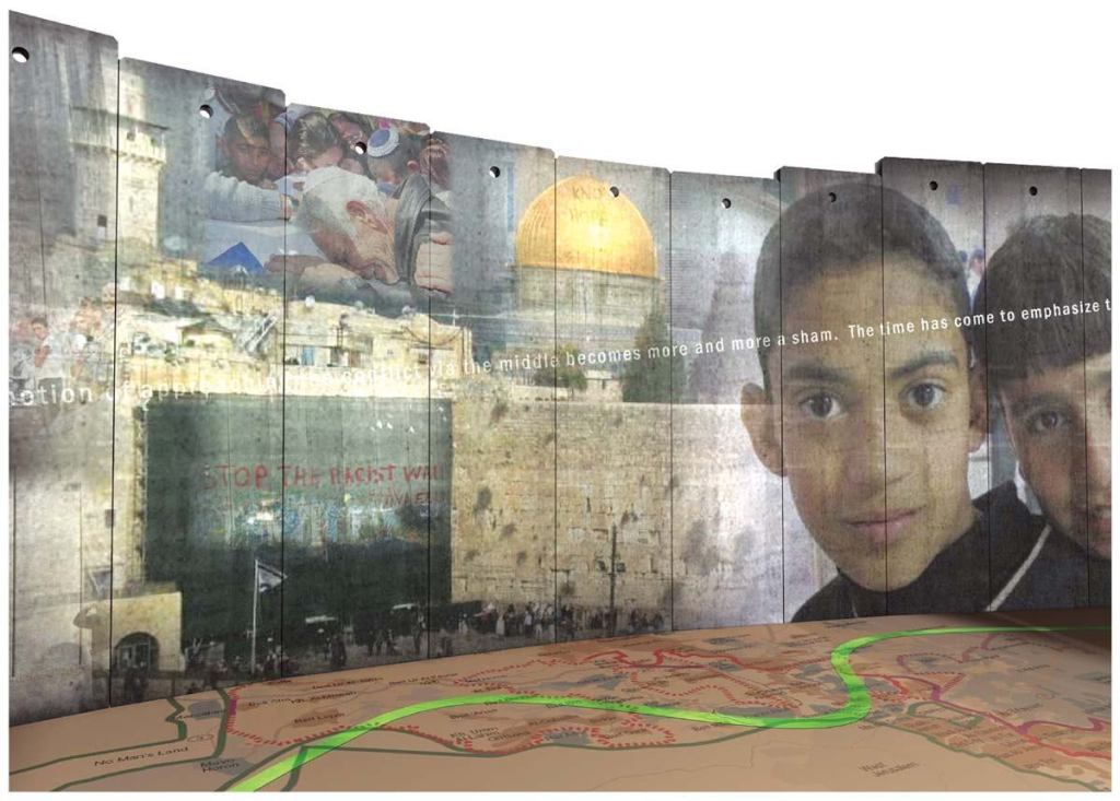 Then a clash among Palestinians in Gaza added a third dynamic. Isenberg shifted from symmetry and the “equal presentation of views” to an asymmetrical setup in which the wall becomes a dividing line between cacophony and contemplation, regardless of one’s point of view. “Design always changes,” he says. “It becomes a collage of both sides intermingled.”