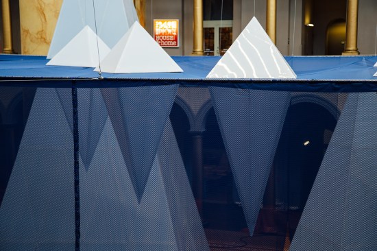 Unlike, say, the Serpentine Gallery Pavilions, which are built on the blank canvas of a grassy yard, the National Building Museum’s installations have the benefit of the architecture of the Great Hall, a soaring enclosed space wrapped by levels of balconies that offer additional perspectives into an installation below. For the Beach and the BIG Maze, these balconies provided a birds-eye view of the ground-level experience. Icebergs doesn’t produce that same effect. The mesh is semi-transparent, providing some perspective on the overall installation, but not the clear overview as in years prior. Instead, your attention is drawn to the peaks of icebergs that surpass the water line.