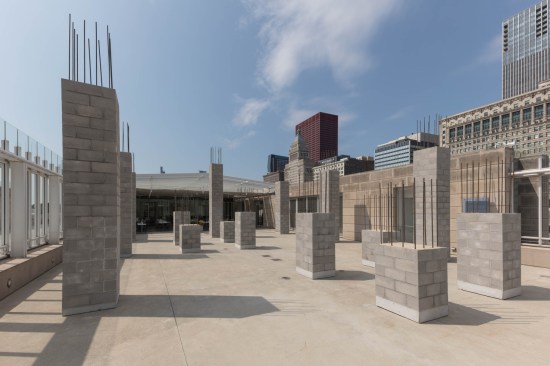 A terrace at the venerable Art Institute of Chicago has been transformed by the hands of Cristóbal Martínez and Kade L. Twist of the collective Postcommodity. Moved by the issue of refugee migration to the United States, Martínez and Twist erected a reminder of Latin American immigrants’ role in shaping contemporary society, culture, the economy, and architecture north of the border. A grid of cinder block piers, topped with rebar, recalls a building site. Whether the construction remains underway, or has been abandoned, is left to the viewer’s imagination. With Each Incentive is on view through April 26, 2020.
