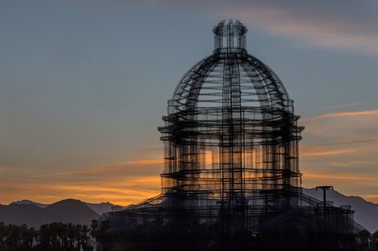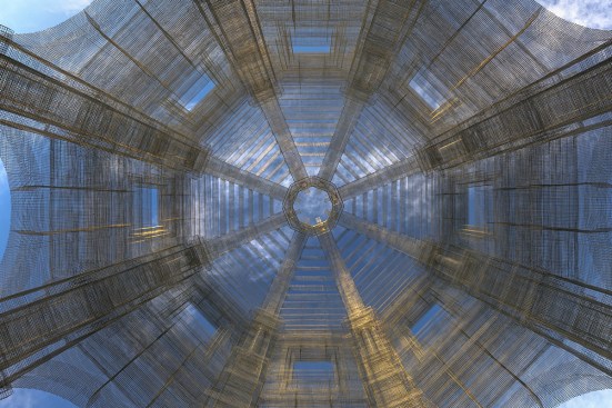 Inspired by Neoclassical and Baroque architecture styles, “Etherea” is made up of three transparent wire mesh sculptures, identical in shape, that measure 36-, 54-, and 72- feet tall. The artwork “follows a growing experiential path where architecture becomes a tool and place for contemplation, a dedicated space where the sky and clouds are narrated through the language of classical architecture,” according to a press release. “The installation plays on the dualism between the pure and the filtered experiences that intertwine with one another, to eventually leave the man at the center of it all. With a passage from a macro-reality to a restricted one, the human body becomes a key to read, discover, measure, and experience reality, just like architecture itself.”