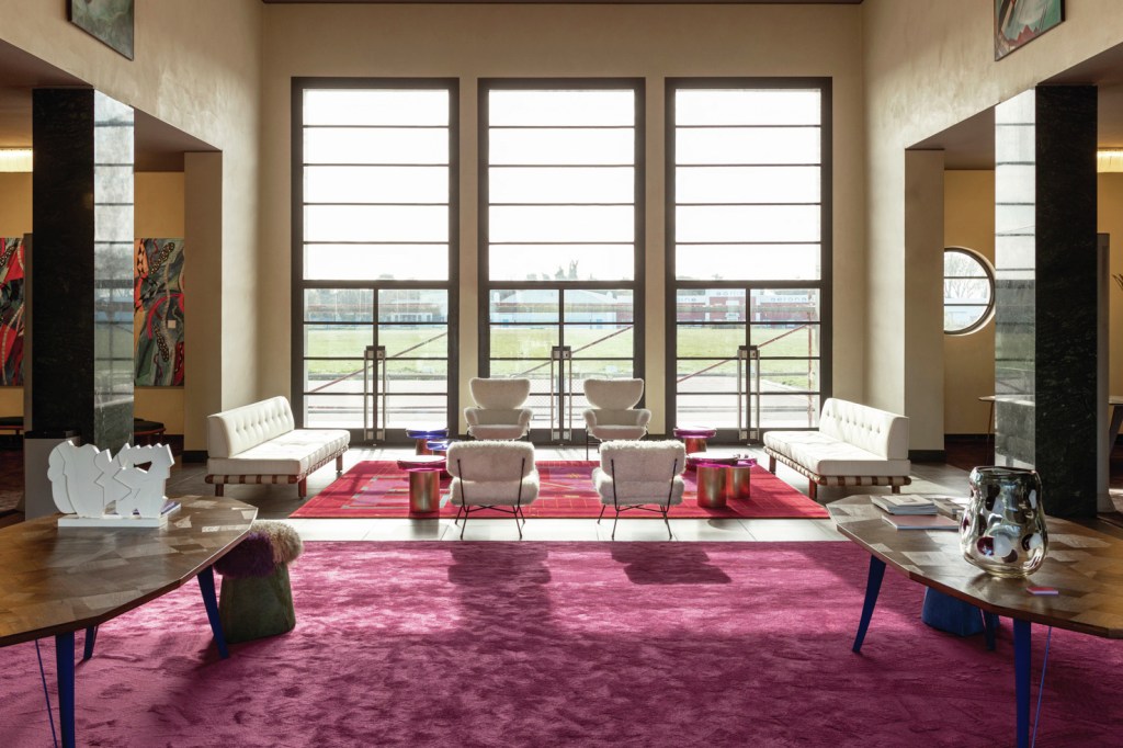 The new Nilufar shop is no ordinary design gallery. Its new home at the Venice-Lido Airport (also known as Giovanni Nicelli Airport, after a prominent World War I Italian flying ace) was designed by architect Mario Emmer in 1926, and now stands as one of the few pre-WWII airfields to survive extensive allied bombing in the region. Today, it serves a select clientele, welcoming the private planes of well-heeled guests attending events like the Biennale and its assorted sister shows in architecture, film, and dance. It is, to put it mildly, an extraordinary space; a minor masterpiece of streamlined Moderne, complete with delicate brick details and ship-like portal windows, the building is an unsung standout in a locale better known for its Gothic palaces and Baroque churches. Inside, it still features authentic period elements like a map of Europe showing the array of routes from the early days of aviation, back when it took two or three stops to reach London.