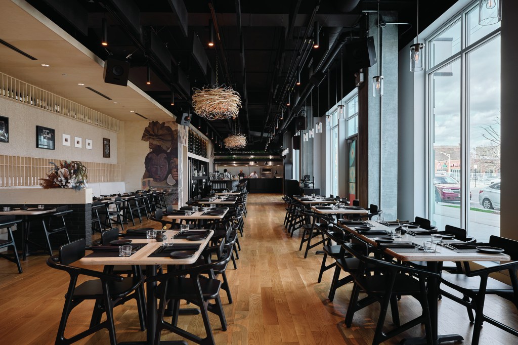 What were the guiding principles for this project? The vision for Bronzeville highlights artists, musicians, winemakers, and chefs, as well the rich culture and futures of the neighborhood—known as the “Black metropolis.” The quiet palette of wood with black accents allows features, such as commissioned works from local artists, to shine. A flexible, open floor plan and efficient back-of-house mean that the restaurant can transform into a space for events like live performances and art exhibitions.