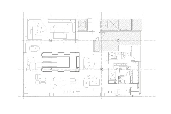 The store is arranged across the first two levels of a 26-story tower located on the corner of Fifth Avenue and 45th Street. The street level’s high ceiling and enveloping windows bring in the cityscape, while a large steel-framed structure acts as a modular construct for display, circulation, and the framing of views. This structure can be merchandised in three modules: the front module toward the entry serving as an exhibition display and “lifestyle” feature, the center module as a seasonal display, and the third module as a shoppable display. The “store window” is a delineated bench that begins at the front of the store on Fifth Avenue and continues to the south window at 45th Street. This bench plays a double role as both a seating area and display surface, engaging with the view of the sidewalk.