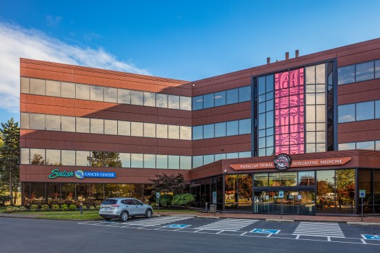 The Salish Integrative Oncology Care Center is located in Fife, WA, contained within the Puyallup Indian Reservation. The Puyallup Tribe founded the hospital to create a unique form of care, blending traditional oncology treatments with integrative medicine techniques like naturopathy and acupuncture. The tribe purchased the existing building in the spring of 2015 in Fife, Wash.—a suburb of Tacoma—and opened the center’s doors to patients almost immediately. The structure required upgrades to its exterior and a re-skin of the brick facility, which was planned with the intent of crafting a cutting-edge metal-and-glass façade that also resembled natural materials.