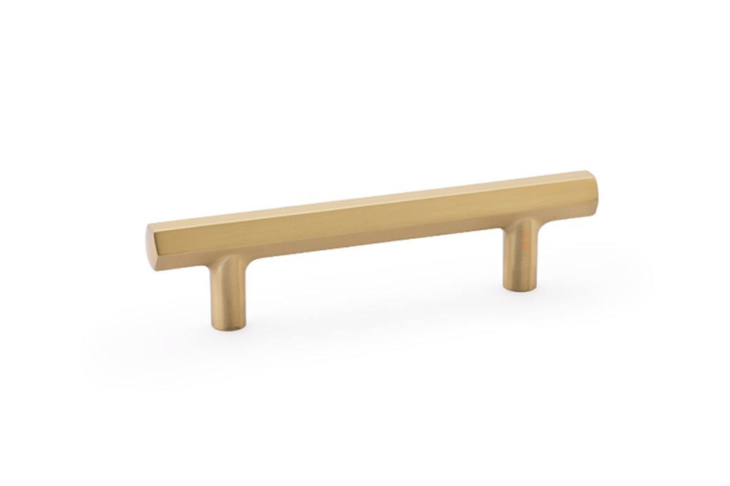 Part of the company’s new Urban Modern Collection, this hexagonal prism cabinet pull is offered in sizes of 3.5”, 4”, 6”, and 8”, and is available in five finishes including polished nickel and satin brass (shown). emtek.com