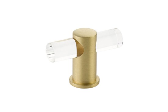 This contemporary cabinet t-knob juxtaposes hard metal with clear acrylic. Measuring 2” in diameter, the fixture is available in five finishes. schaubandcompany.com