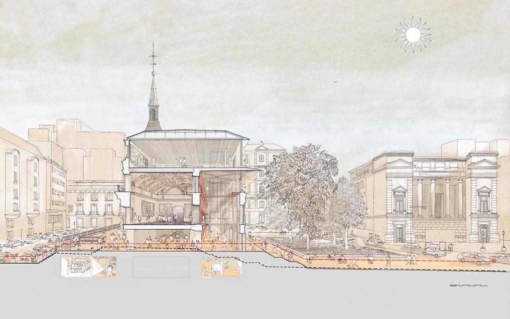 The transformations include replacing the historical site’s roof, and reorganizing the floors to create new gallery and communal spaces. A main area of focus within the historic building is its southern façade, which. To fully reveal the original form of the structure, multiple floor plates will be removed, which will also open up the area to create an indoor public plaza, dubbed the new Prado Campus. This space will be used for gatherings, dinners, recreation, and special events—hankering back to Philip IV’s original vision. The facade’s original openings will also be reestablished, allowing sunlight into the interiors and bringing back the edifice’s relationship with the outdoors.
