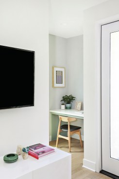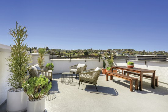 Each unit includes a small “tech station” with a built-in desk and USB hookups, and buyers have the option of expanding the workspace to an adjacent bonus room. Each residence has a private rooftop deck—a prime amenity in urban, high-density environments. They offer space for year-round entertaining in the region’s temperate climate and provide vistas of the San Gabriel Mountains and city lights. The architects also added small balconies off the kitchen, making it possible to enjoy the outdoors without going upstairs.