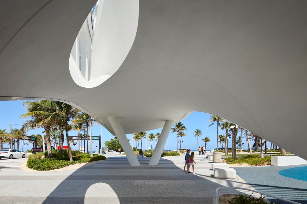 On the park’s northern edge, a coastal plaza acts as a shared space that calms traffic and frames the park’s entry. Here, a “shade hammock” of trees filters the intense Florida sun, creating dappled light over the plaza and walkways.