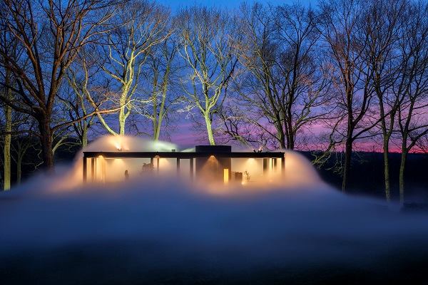 And then, at the stroke of the digital clock, it was gone. The moment the jets stopped, the mist dispersed, and there was the Glass House in the sun, looking like it has for the past 65 years. What remained was a new question: Was the fog the theater curtain, or the main event? Figure, or ground? “Veil” stands in for all of the other buildings on the 47-acre property that typically act as the supporting cast for the Glass House, and even for the landscape itself, carefully sculpted, dotted with sculpture, lit to create outdoor rooms. The fog seems to be in particular dialogue with the lighting of Richard Kelly which, if you are on site after dark, makes the open fields feel like containers for the small buildings. As the mist fills up the verge between the Glass House and the parapet, it forces you to consider the dimensions of that space in a way you probably hadn’t before.