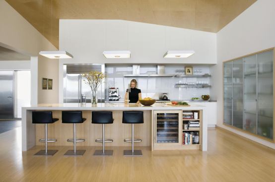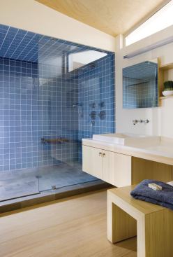 Opposite the sleeping spaces, a roomy kitchen (one family member is a chef) flows into an airy living room connected to the bay through a soaring glass wall. This west-facing view presented another challenge to the team’s zero-energy goals. Glass with a low heat gain coefficient mostly saved the day, coupled with a well-insulated envelope that thermally and mechanically offsets the gains. Although the sun’s rays are an issue for keeping the house cool, they also provide most of the energy to do just that. And where 11.7 kW of solar panels leave off, a geothermal HVAC unit picks up. An energy management appliance integrates those renewable resources into the grid and maximizes energy efficiency.