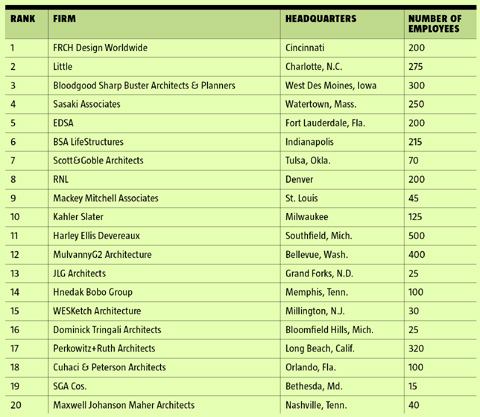 Topping the list of 20: Cincinnati-based FRCH Design Worldwide; Little, in Charlotte, N.C.; and Bloodgood Sharp Buster Architects & Planners, in West Des Moines, Iowa.