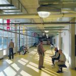 Weaving the ground-floor spaces together is a broad, L-shaped corridor known to residents and staff as “the yellow brick road.” Its outdoor benches, street lights, sidewalk trash receptacles, and street signs were incorporated to engender familiarity, Tigerman notes. The 20-foot-wide circulation space, whose concrete floor is finished with bright yellow epoxy paint, has reinvigorated the mission, says Fuller. “It’s a very interactive kind of place?very much like a street,” he adds. The glass-enclosed corridor wraps two sides of the courtyard, allowing borrowed light to enter deep into the building.