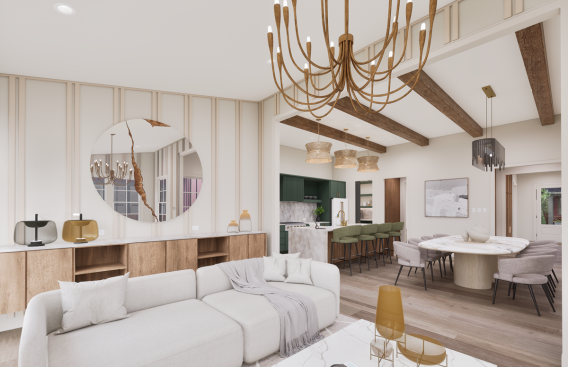 Beyond the ability to reconfigure the layouts to address rental or multigenerational potential, the rooms and spaces within the central living areas shift quickly to display several trending, lifestyle-supported spaces, including flex space for bedrooms, a mudroom, a coffee bar, a dedicated pet area, and a dirty kitchen, which is the open-concept floor plan’s hardworking neighbor.