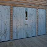 Another energy-efficient feature is the entry door from Pella, a prominent Iowa manufacturer, which vacuum seals and has an R-value of 45. For a decorative touch, the students covered the wide door and two smaller side doors with panels made from 80% recycled grain and etched them with a wheat motif.