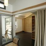 The group wanted to use a NanaWall system to divide the interior space, but adding that element would have significantly increased the home’s cost and would not meet the school’s desire for a home that could be easily replicated, says Brandon Vong, an architecture student. So, the team divided the living room and bedroom with a simple but attractive floor-to-ceiling beige-color curtain.