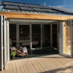 The heart of the house is an enclosed sun porch with a black stone floor that collects thermal energy during the day and releases it at night, the student builders said. The sun porch features custom-designed movable glass walls from NanaWall that increase ventilation and extend the living space to the outdoors.