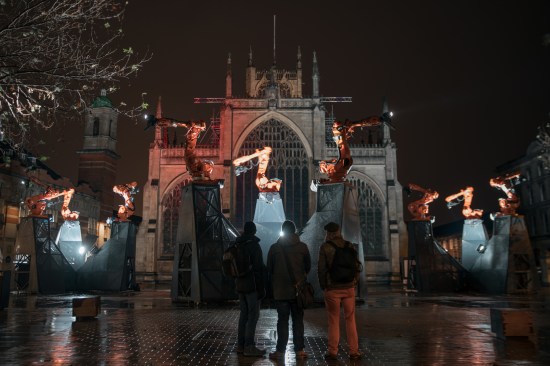 Three areas in Hull’s Old Town have been selected for the site-specific installation, which is meant to “…encourage people to explore the city’s nighttime streets as dormant robots awaken, responding to the city’s architecture, and interacting with one another and with Hull’s residents and visitors.”
