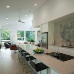 The LEED-Platinum project started with a sustainable teardown of the original 1960s home, a dark and outdated ranch. Due to a compromised concrete foundation, the structure was not livable but the clients were committed to thorough deconstruction. More than 80% of materials were recycled or repurposed through the local Habitat ReStore, Davison says, including roof tiles, windows, doors, light fixtures, casework, fixtures, appliances, flooring, and trim.