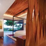 Inside, the living room’s billowing ceiling, digitally cut from an off-the-shelf glulam beam, is an abstracted grass skirt and a nod to the island’s wood-carving tradition. In the master bedroom, the headboard and ceiling suggest palm trees. The mosaic on the powder room wall is computer-generated, too. Belzberg used a pixilated photo of the client’s favorite orchid to model the location of the tiles.