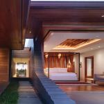 But in building code parlance, it’s a main house with one detached building. When local regulations prohibited the indoor-outdoor pavilions the owners asked for, Belzberg and his team came up with four structures of varying sizes, two on each side of an outdoor hallway. Recycled teak timbers reach across it, joining the garage/guest quarters pod on one side with the main living pod and separate media room on the other. The children’s pod, which holds bedrooms and play space, stands on its own beside the motor court.