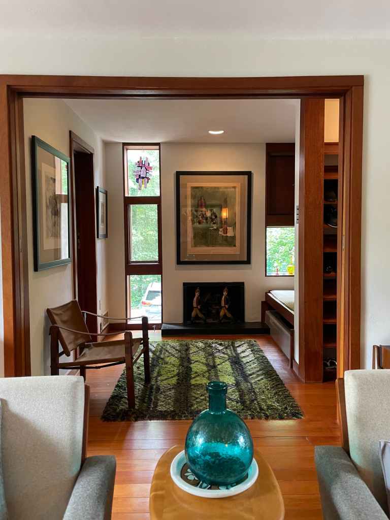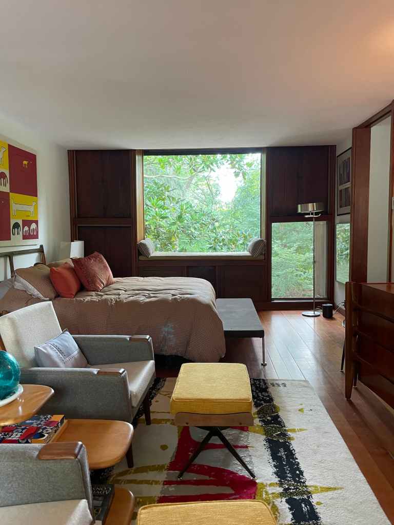 Each space is clear and defined, and yet open to what is next to it. The living room is so grand you wonder how it fits into the mall volume. The different spaces are tailored to their uses without there being a sense that they are defined by being a place to sleep, eat, read, or socialize. The outside is everywhere present, but in its place, beyond the wood frames. Here the composition of the windows makes sense: some are for looking out, others for letting light sweep over you. The one tour-de-force beyond Wharton Esherick’s handiwork, which also includes a copper backsplash in the kitchen, is the window in front of the chimney that turns that piece into a still life when you view it from inside.
