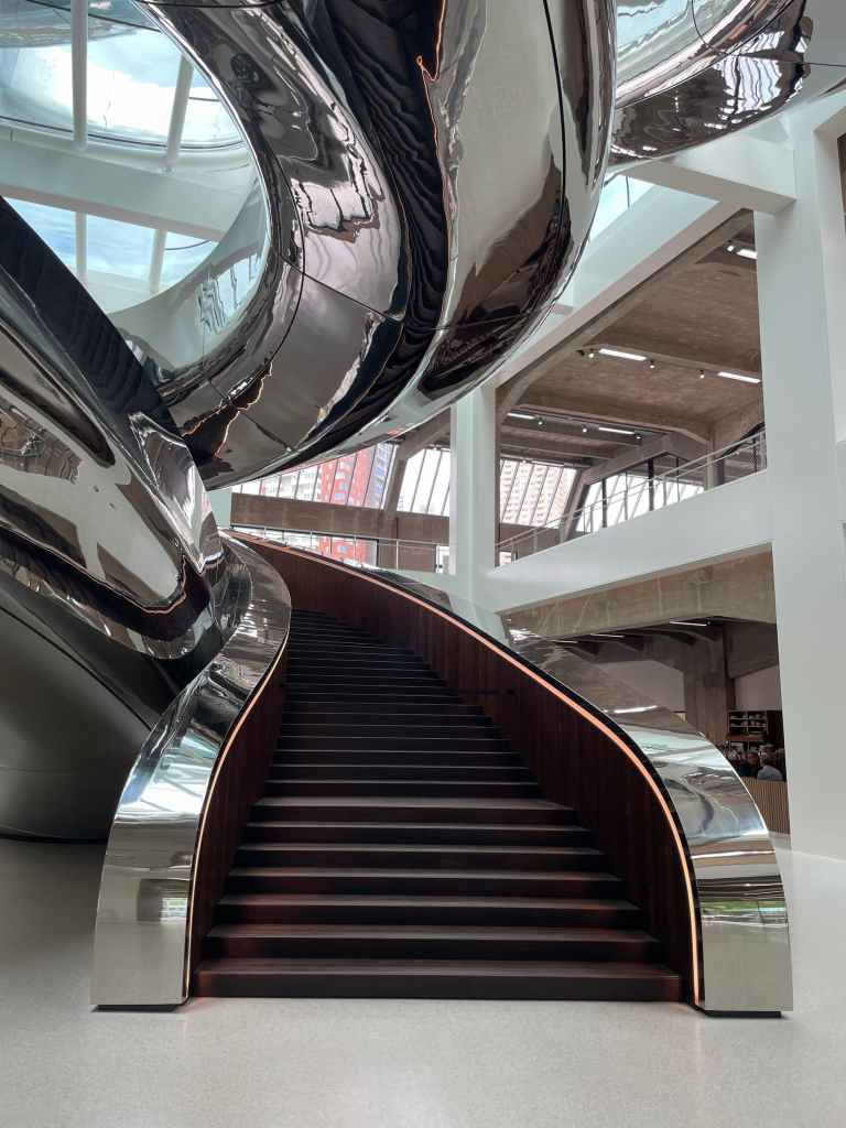 The museum calls the staircase a “tornado,” and the gleaming object certainly has the energy and expressiveness of that weather phenomenon. It also calls to mind the grand staircases that lead cultural elites up the center of such grand institutions as Garnier’s Paris Opera House of 1875. The stair is finally also a metaphor for the movement of peoples in an often violent and fluid (i.e., over the seas) manner. Whatever it means, it is beautiful, a seductive nest of snakes made of continuous curves wrapping around itself and shooting up through and above the building from an open public space outfitted, as is standard operating procedure in museums these days, with restaurant, shop, and  catering opportunities.