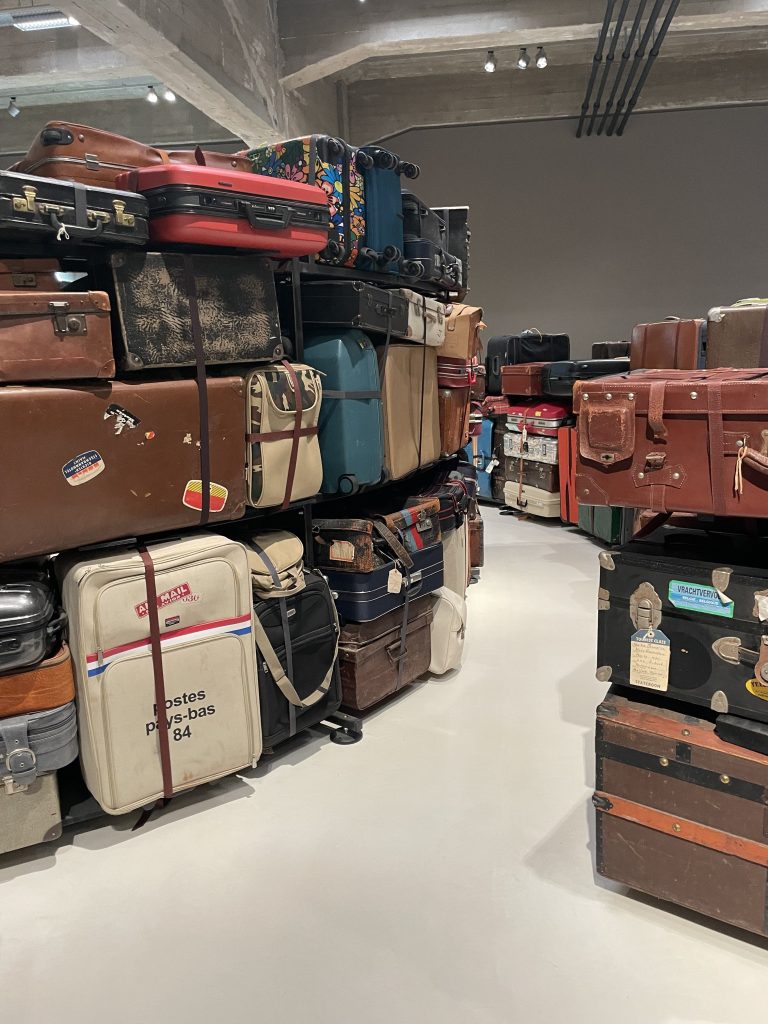 The most spectacular object is the “suitcase labyrinth” of stacked valises, trunks, and roll-ons donated after an open call the museum sent out. With their stickers indicating where they came from or went to, their dings and scratches, and their worn handles, the suitcases come together to surround you with the memory of travel and all the dislocation that act, whether voluntary or forced, entails.
