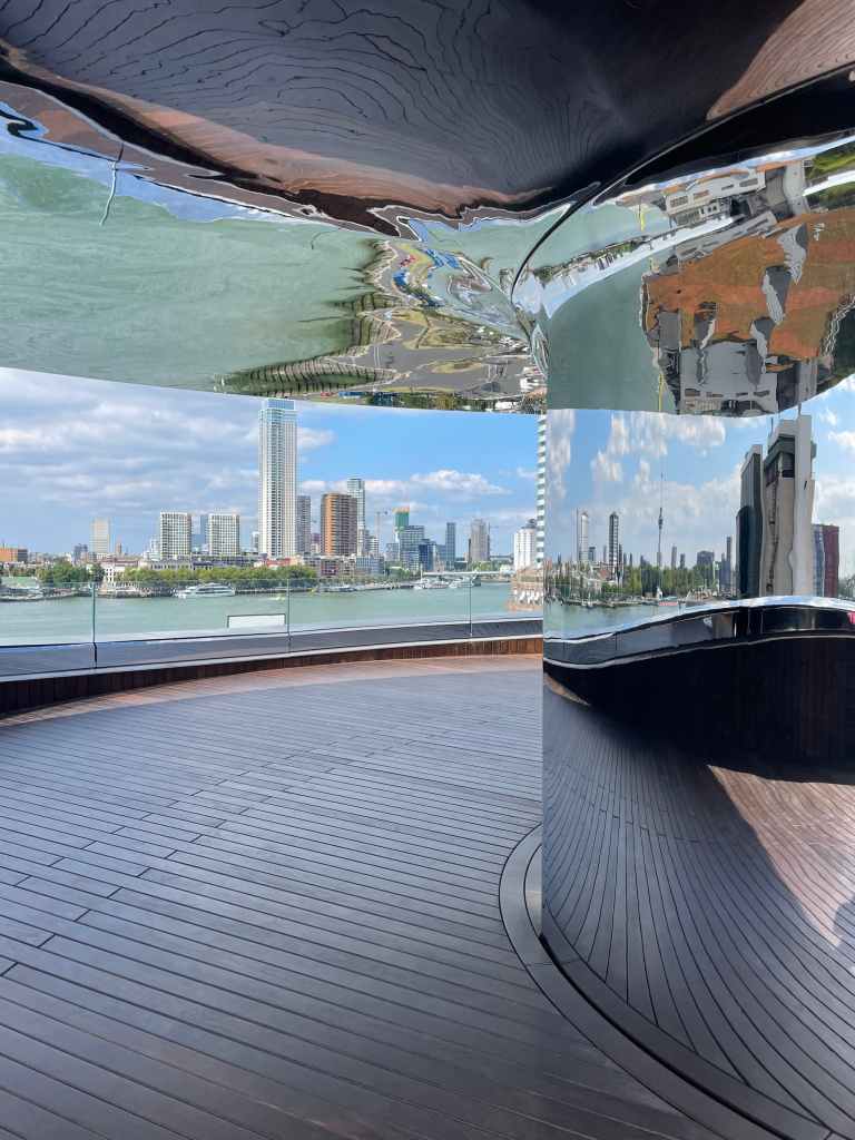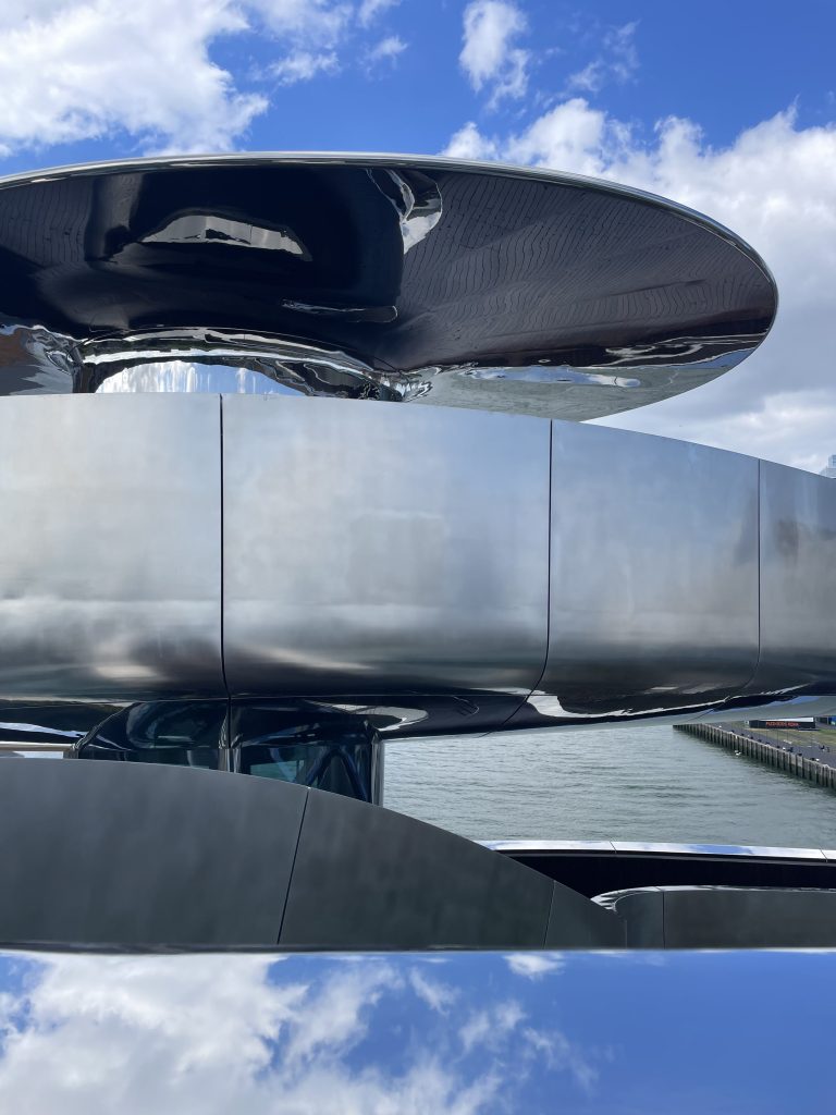 Fenix then hired Ma, who also designed the soon-to-be-completed Lucas Museum in Los Angeles, to transform the warehouse into a home for both this museum and an as-yet not finished performance center adjacent to the now open exhibition space. In response, the architect indeed made the grand central staircase. It is a flash of stainless, polished steel rising out of the middle of the concrete-framed building into a double helix that comes together only at the top, where it forms an observation point from which you can view Rotterdam’s center.