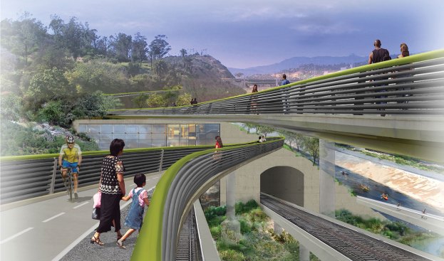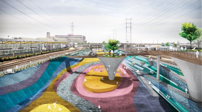 Now some of those same protesting designers, such as Mia Lehrer, have produced designs for a short stretch of the river, the results of which are perfectly fine in terms of providing access, restoring some natural water flow and vegetation, and hinting at dynamic diagonals that will shape public parks. They stop there, however, giving little hint of how this work with make a material difference in the overall ecology of the river or how it will affect the health and welfare of those who live near its banks.