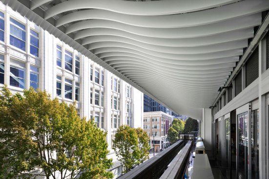 The updated station is the transit gateway to the new $1.15 billion Climate Pledge Arena, the world’s first net-zero-carbon arena. The 0.9-mile monorail track links the city’s light rail system to the 17,459-seat venue, the Space Needle, and other attractions at the 74-acre Seattle Center.
