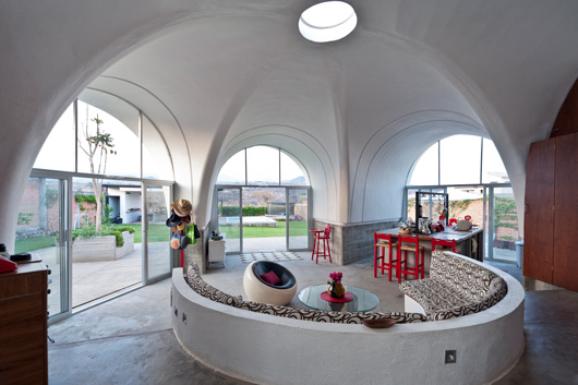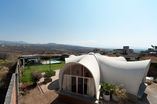 Productora, a Mexico City–based architectural studio, took on the task of recycling these found objects to create one 970-square-foot home on a plot of land in Tlayacapan, Morelos, Mexico—a town located in central Mexico one hour outside of the capitol. Reassembling the pieces was the first priority, which was achieved by forcing the archways together, and then covering them with a new sheath of polyester and fiberglass. From the outside, the finished product is a voluminous, space-age home with multiple entrances. Structural support is provided by a rectangular concrete plinth, which extends up the bases of the “petals” of the flower-shaped home. This element also raised it a meter above ground level, providing more building space to create larger interiors.
